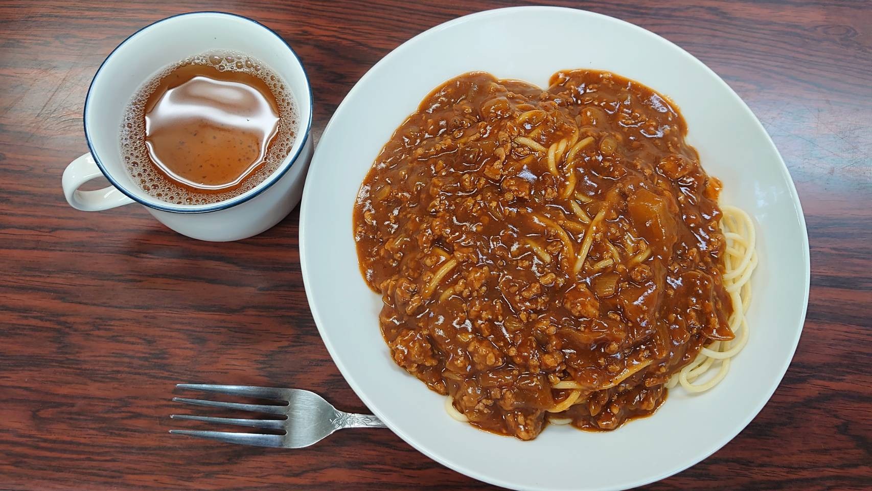 今日の梅金食堂のお昼ご飯は、ミートスパゲッティでした。