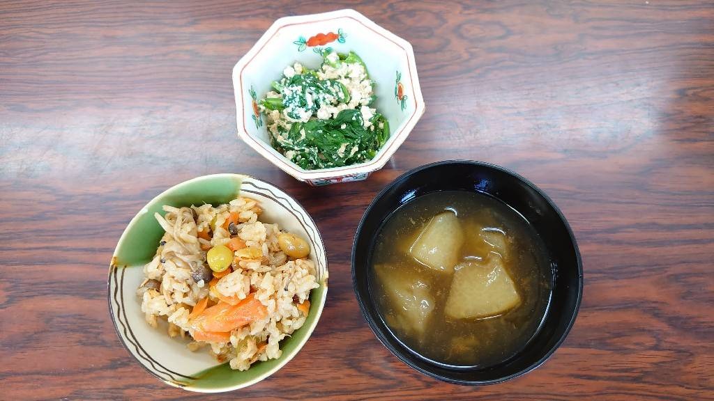 今日の梅金食堂のお昼ご飯は、しめじご飯と冬瓜汁とほうれん草の白和えでした。冬瓜汁は出汁がきていて温かくて美味しかったです。