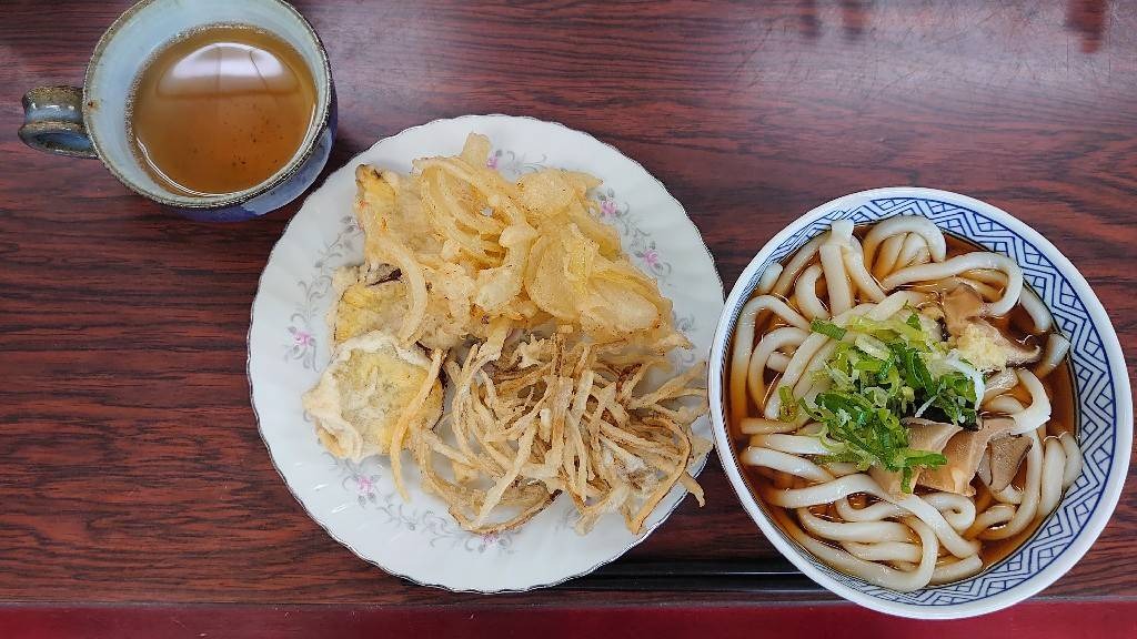 今日の梅金食堂のお昼ご飯は、うどんと天ぷらでした。天ぷらは、ゴボウと玉ねぎとサツマイモでした。