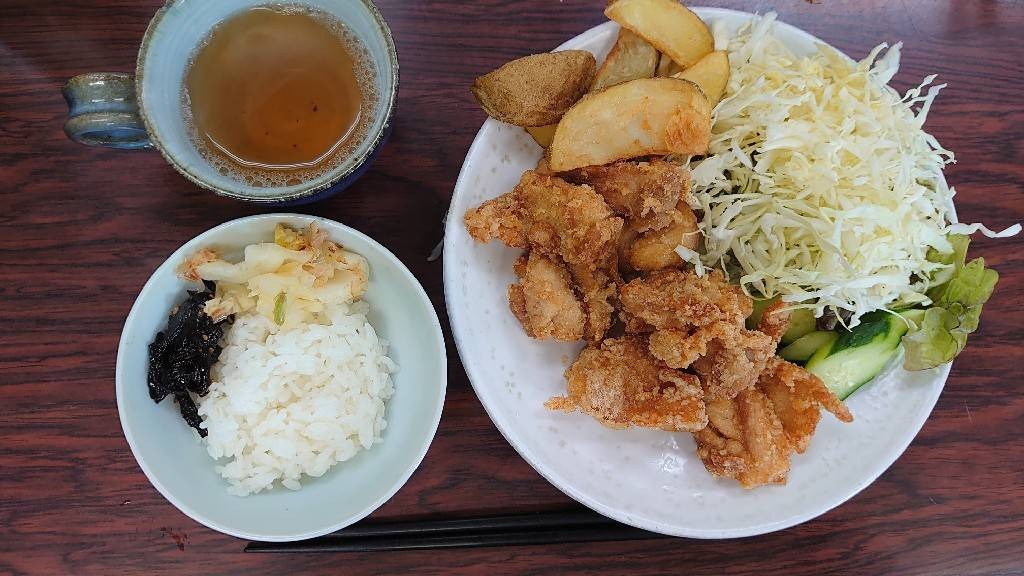 今日の梅金食堂のお昼ご飯は、からあげとポテトフライとキャベツの千切りサラダでした。
